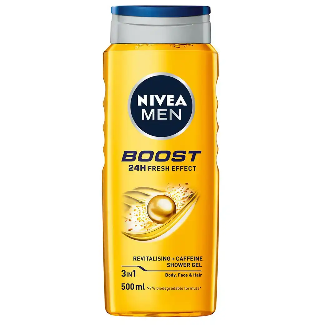 شامپو سر و بدن مردانه نیوا بوست فرش افکت 24 ساعته (Nivea Men Boost Shower Gel) یک شوینده چند منظوره برای آقایان است که برای شستشوی سر، بدن و صورت طراحی شده است. این شامپو نیوا مردانه با فرمولاسیون حاوی کافئین و رایحه با طراوت خود، حس انرژی و شادابی را به پوست میبخشد و تا 24 ساعت اثر تازگی را حفظ میکند. بسیاری از آقایان به دنبال یک شامپو سر و بدن مردانه خوب هستند که علاوه بر پاکسازی، حس طراوت طولانی مدتی را نیز به همراه داشته باشد و این محصول میتواند یک انتخاب عالی باشد. استفاده از این شاور ژل نیوا به داشتن پوستی تمیز، با طراوت و موهایی خوشبو کمک میکند.